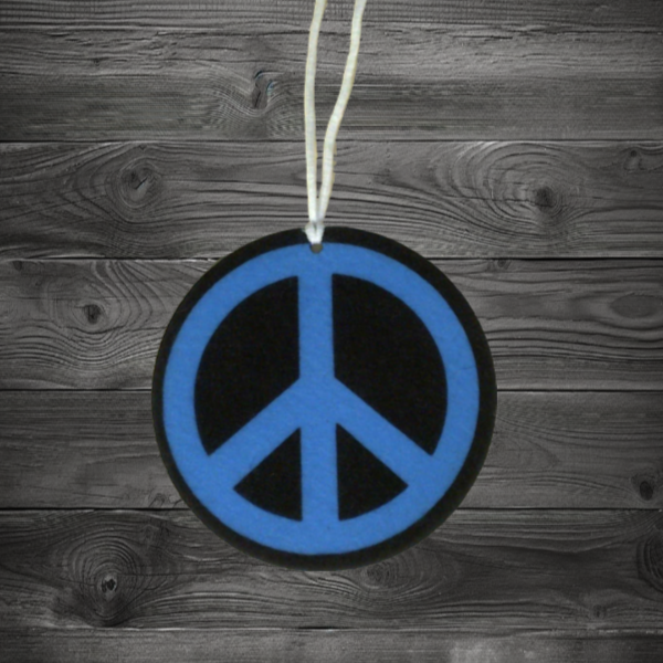This 3.5-inch round air freshener features a retro hippie design with a black and blue peace sign, combining classic style with effective odor control. Its compact size makes it ideal for cars, offices, or small spaces, providing a subtle, refreshing scent while adding a touch of vintage-inspired decor. Durable and easy to hang, it’s a practical accessory for maintaining a pleasant environment wherever you go.