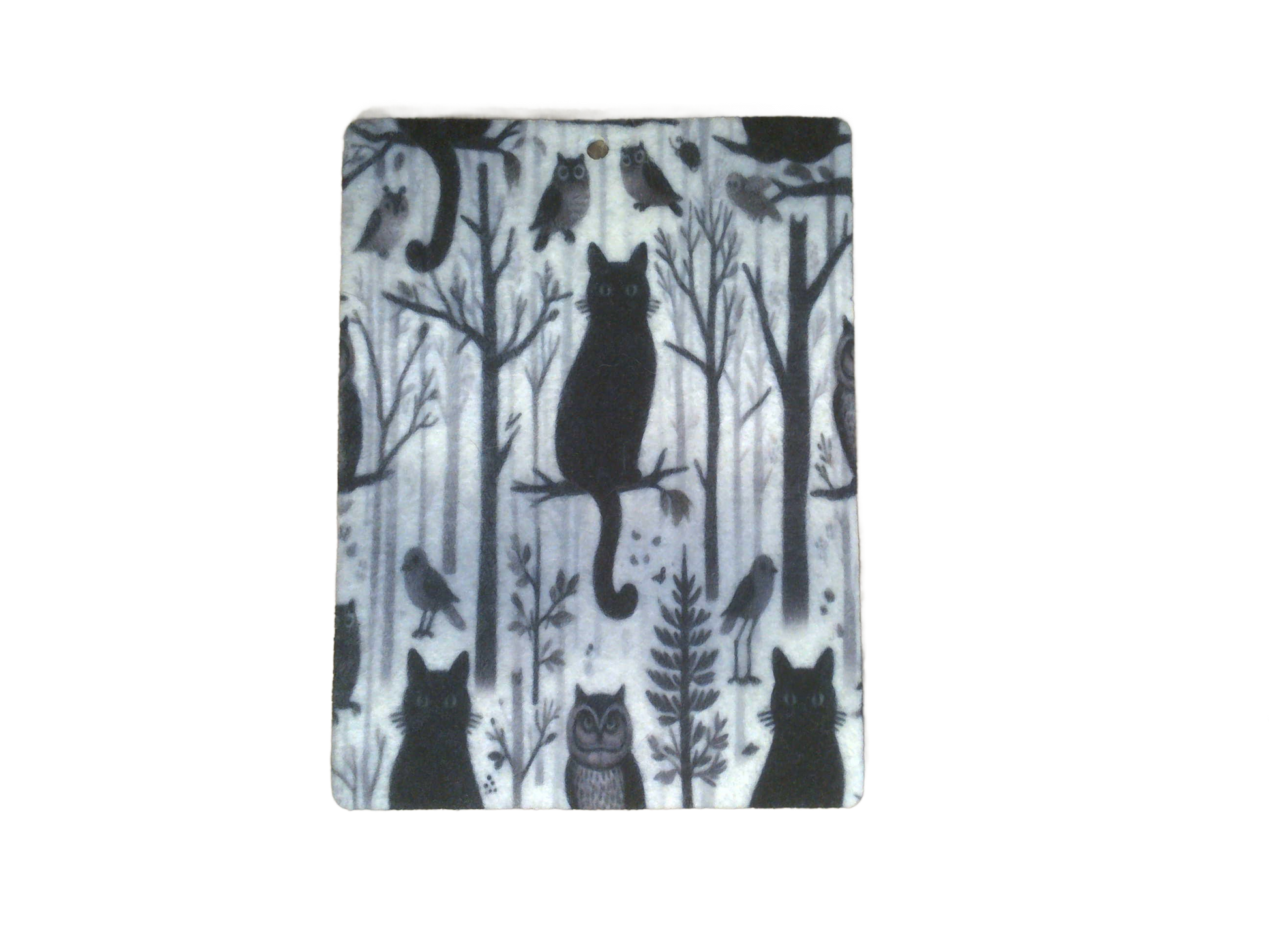 Our Air Freshener - Black Cats & Birds features a durable 100% polyester fabric measuring approximately 3”x4”. Each piece is hand sublimated to ensure vibrant, lasting designs. It includes a convenient hanging cord and comes with a 2ml spray fragrance of your choice, allowing you to customize your space with both style and scent. Perfect for adding a subtle, refreshing aroma while showcasing unique artwork.