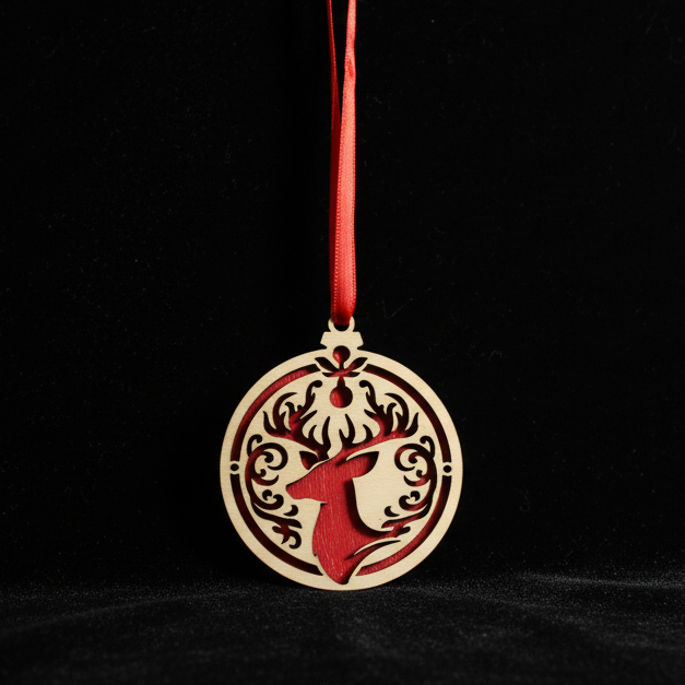 Handcrafted wooden Christmas ornament featuring a charming reindeer design set against a vibrant red background. This 2 1/2" keepsake brings warmth and festive cheer to any tree. Perfect for collectors, gift-giving, or adding a rustic touch to your holiday décor. Each ornament celebrates the spirit of the season with timeless appeal.